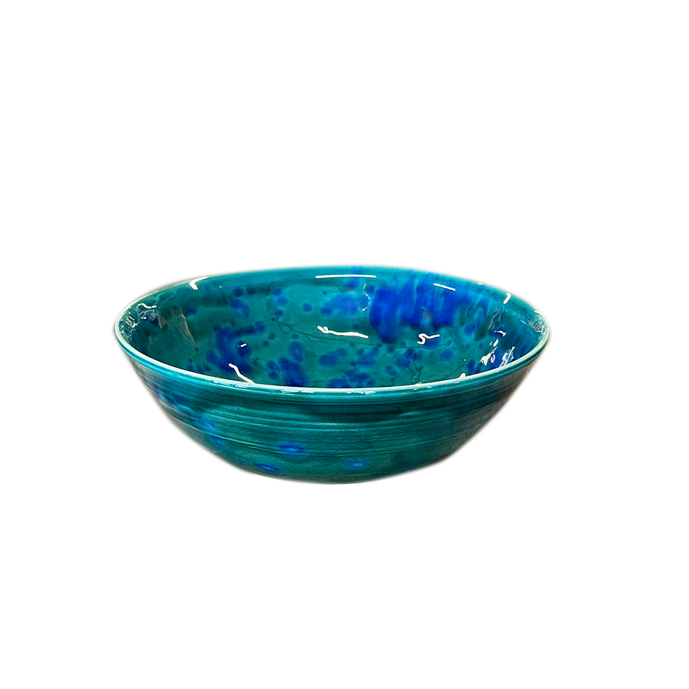 Ceramic bowl with multicolored pattern in a beautiful turquoise. Handmade by Matin Malikzada in Connecticut. Matin fled Afghanistan in 2021 and is now working locally. Measures 6"