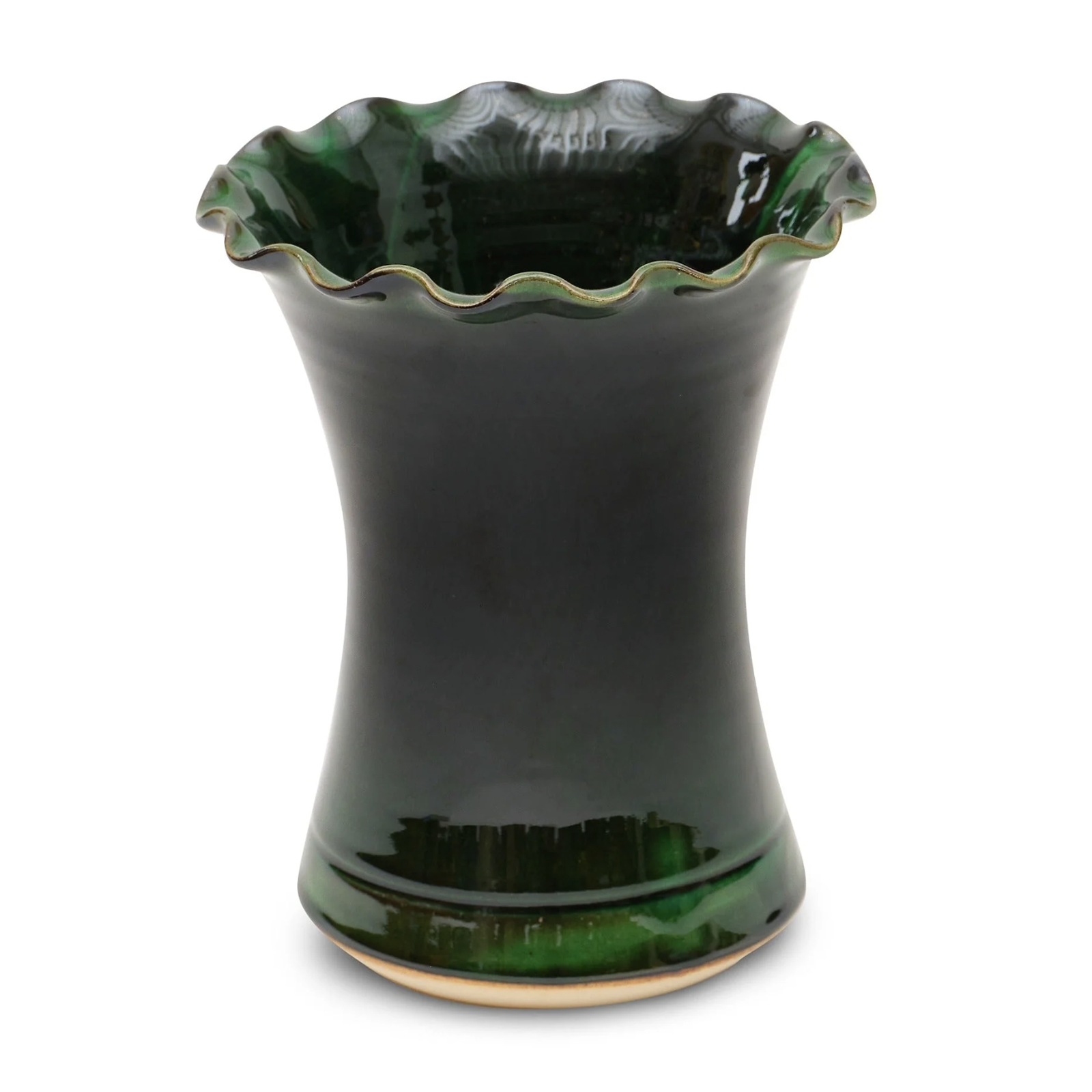 A wide mouth carafe shaped case with a ruffled edge and rich jade glaze. This piece is part of an exclusive collection of handmade pottery designed and developed for Bunny Williams Home by famed Afghan potter, Matin Malikzada. 8"H