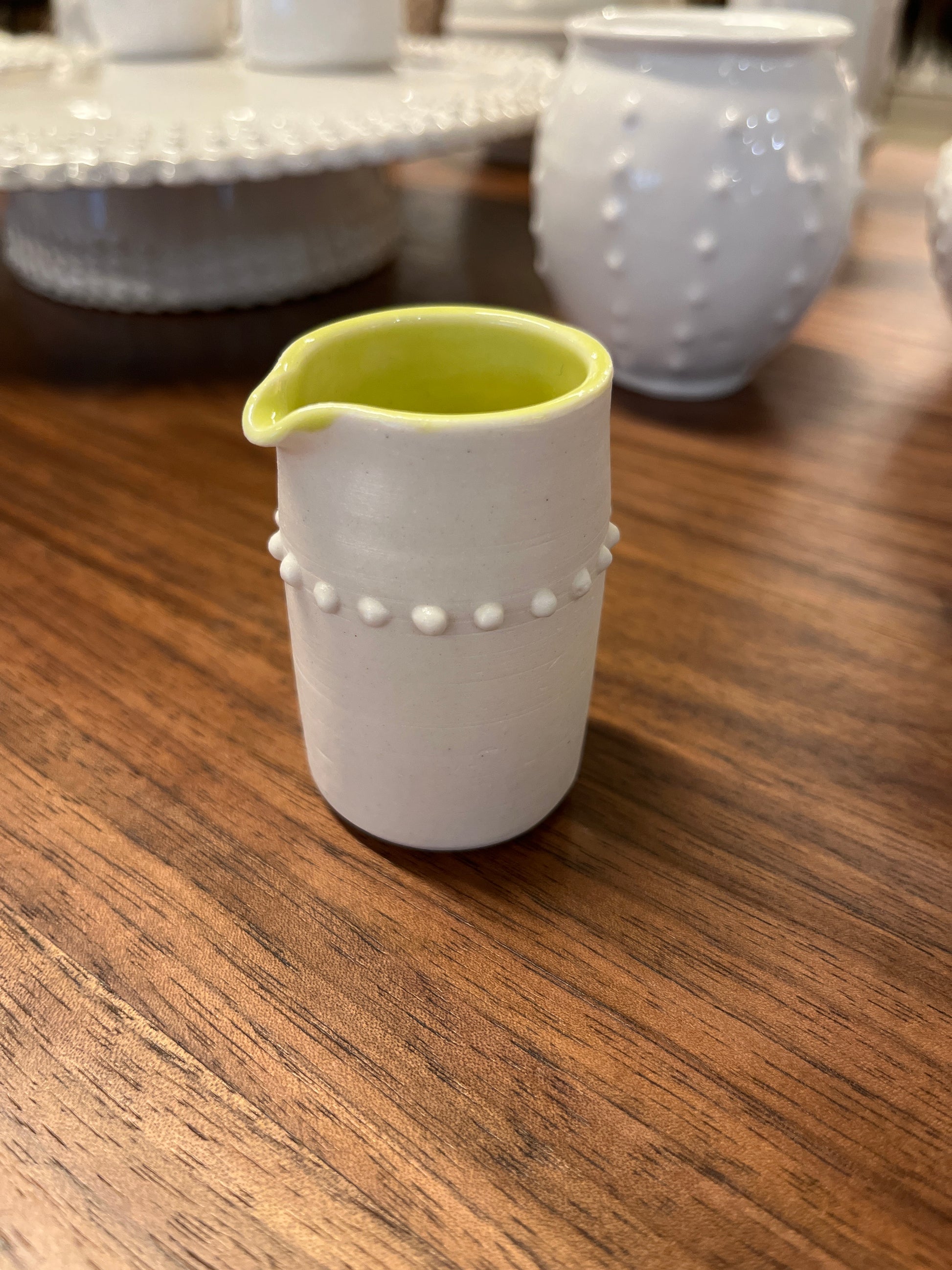 Small creamers/pitchers in a variety of colors. Handmade by Sheila Fox in Salisbury CT.