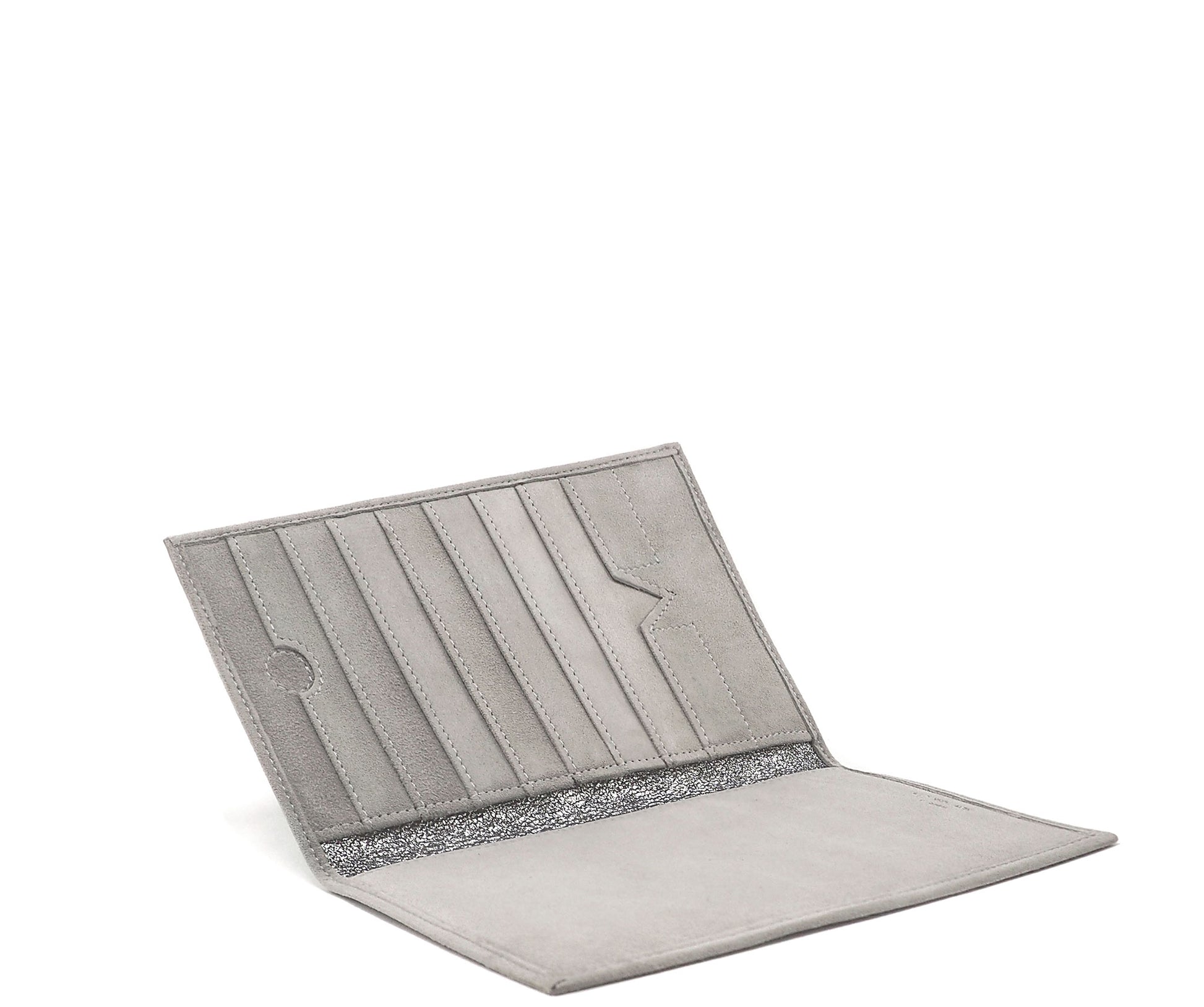 A luxuriously soft suede. Alongside are eight card slots and two large pockets that can accommodate a checkbook, passport, and other small documents. Handmade in New York City.