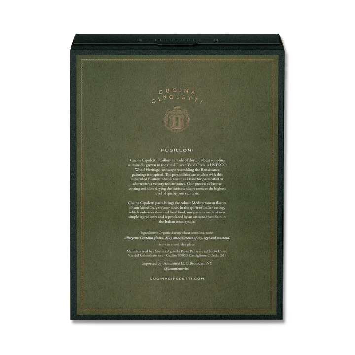 Cucina Cipoletti Fusilloni is made of durum wheat semolina sustainably grown in the rural Tuscan Val d’Orcia, a UNESCO World Heritage landscape resembling the Renaissance paintings it inspired. The possibilities are endless with this supersized fusilloni shape. Use it as a base for pasta salad or adorn with a velvety tomato sauce. Our process of bronze cutting and slow drying the intricate shape ensures the highest level of quality you can taste.