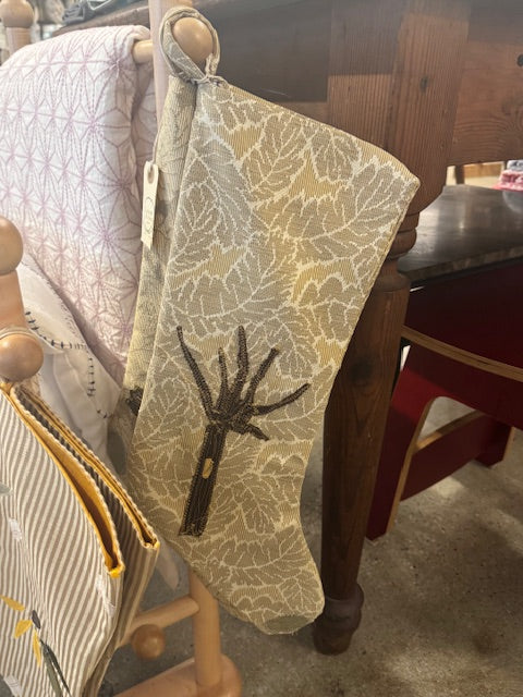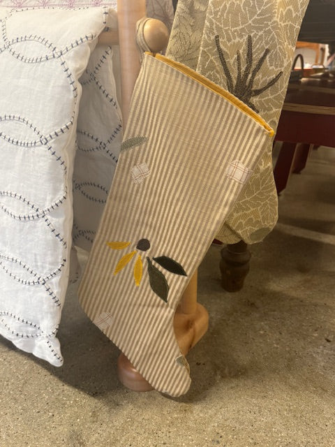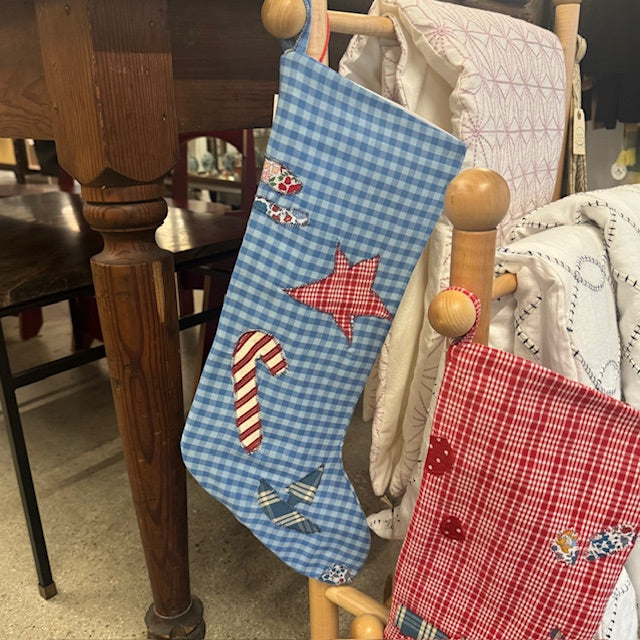 Hand-cut applique stockings in gingham check, stripes, and leafy fabrics and designs by Green Acres Supply Co. Perfect for kids and adults alike! Some variations due to the handmade nature of the item.