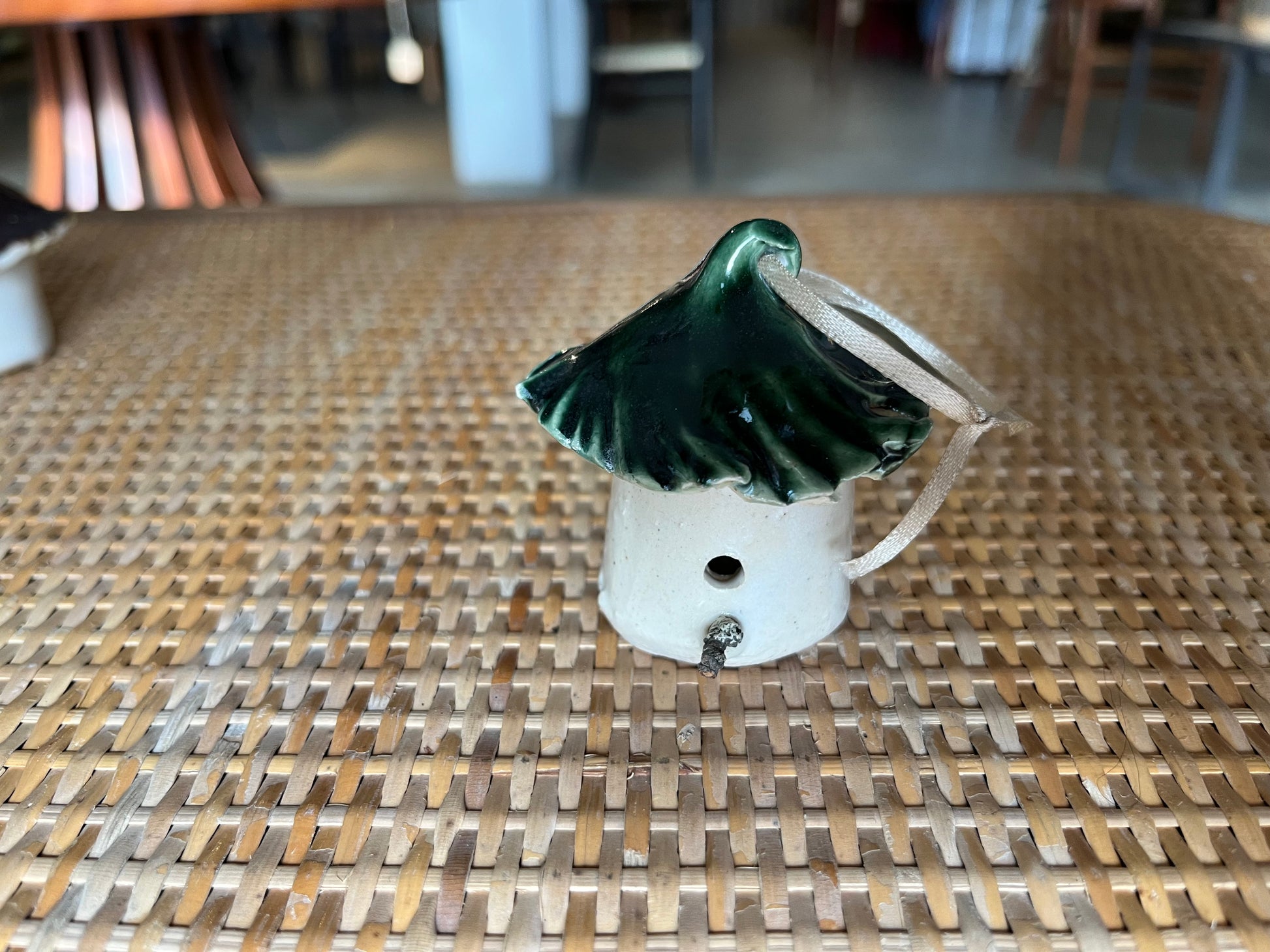 Delightful ceramic birdhouse ornament handmade by Watertown Potter Pam Church