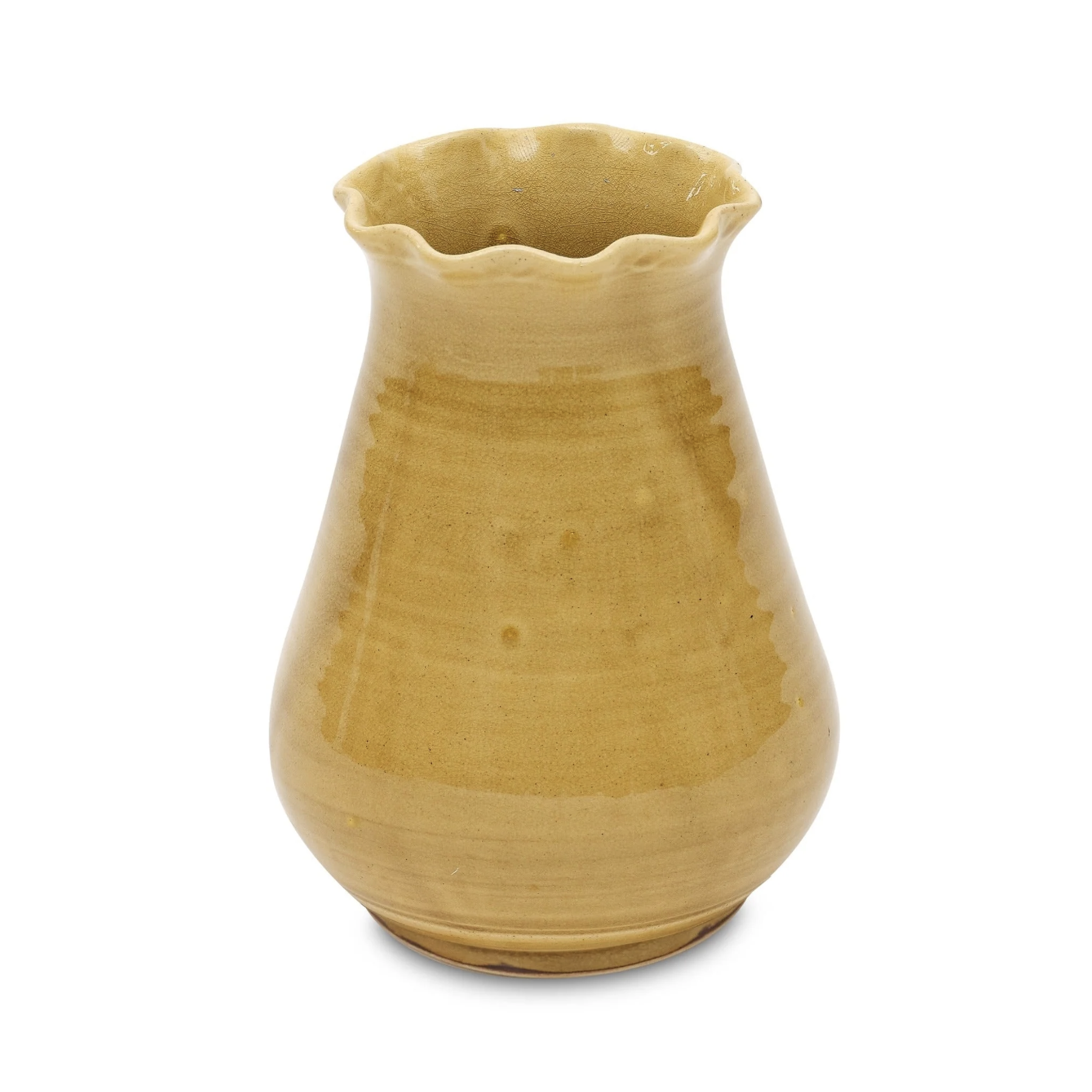 A narrow mouth vase with a ruffled edge and rich yellow glaze. This piece is part of an exclusive collection of handmade pottery designed and developed for Bunny Williams Home by famed Afghan potter, Matin Malikzada. 8"H