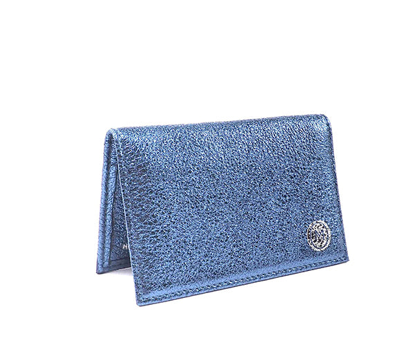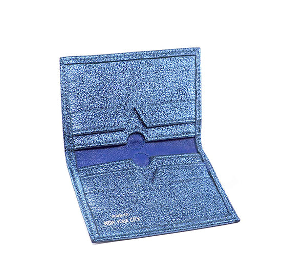 The Folded Card Wallet opens to reveal a pop of colorful lambskin. Each side features a set of two card slots, cut and stitched in the distinctive “OM” style. 4" x 3"
