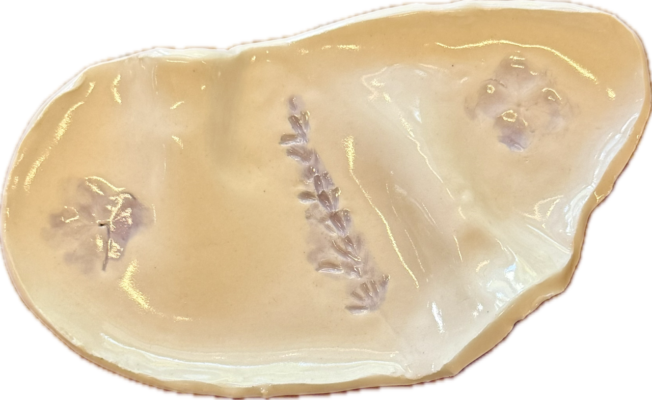 Accented with hand imprinted lavender and hydrangeas from her garden on River Road, this piece was handmade by River Road Ceramics in West Cornwall, CT. Perfect for jewelry or as a sculptural accent. 5.5" x 3.25