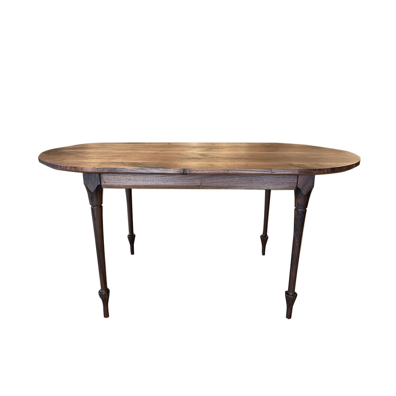 Beautiful handmade walnut dining table with delicate turned legs by local artisan Ari Kardasis.